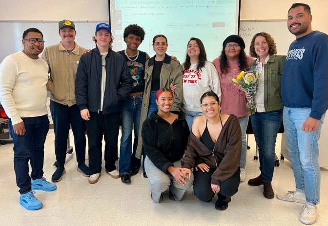 Below, Professor Skonieczny is pictured with her International Relations 550 class, a capstone course in which undergraduate students write a thesis. She is shown here holding a bouquet of flowers.
